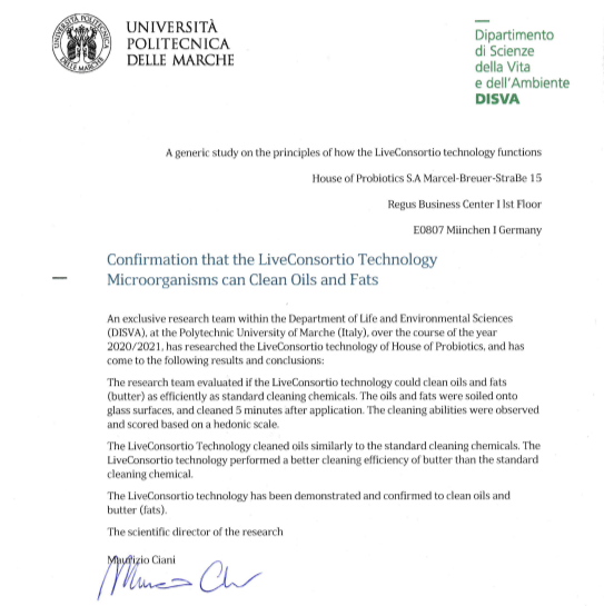 Die Wirkungsweise der von uns verwendeten lebend-aktiven Mikroorganismen wurde von der Universität Ancona in einer wissenschaftliche Studie geprüft und bestätigt.
