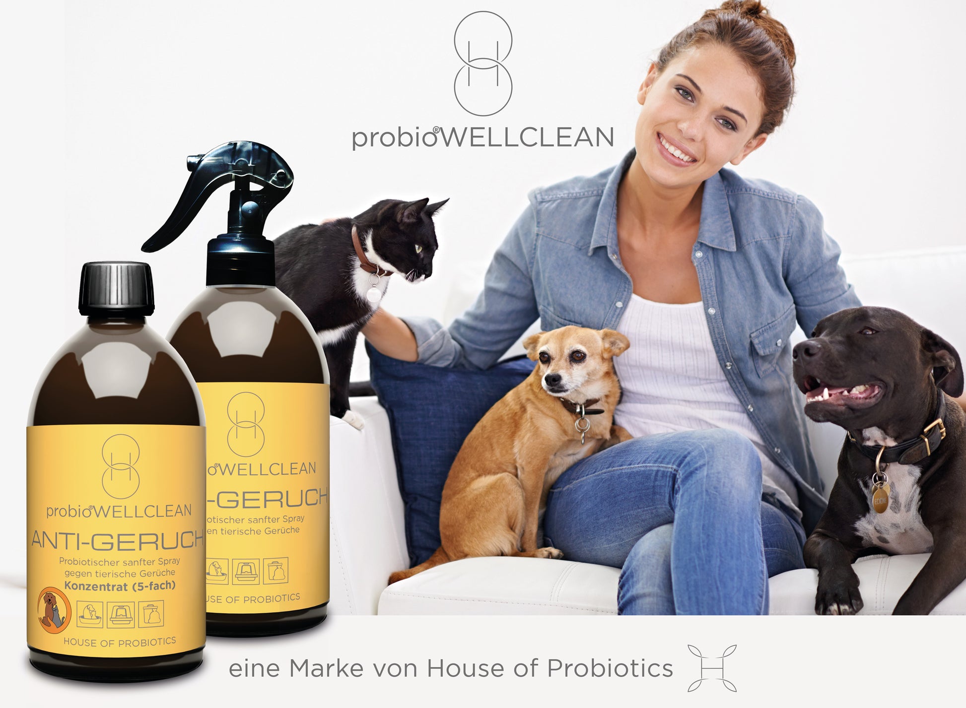 Alle probioWELLCLEAN Produkte sind haustierfreundlich und somit für die Lebensräume von Hunden und Katzen sehr gut geeignet. Alle Inhaltsstoffe sind 100 Prozent natürlich und die verwendeten Mikroorganismen kommen ebenfalls aus der Natur. Das ANTI-GERUCH Spray gegen tierische Gerüche wurde sogar ganz speziell für das Einsprühen von Liegeplätzen und Toiletten-Umgebungen konzipiert – und zwar ganz ohne die Verwendung von ätherischen Duftölen.