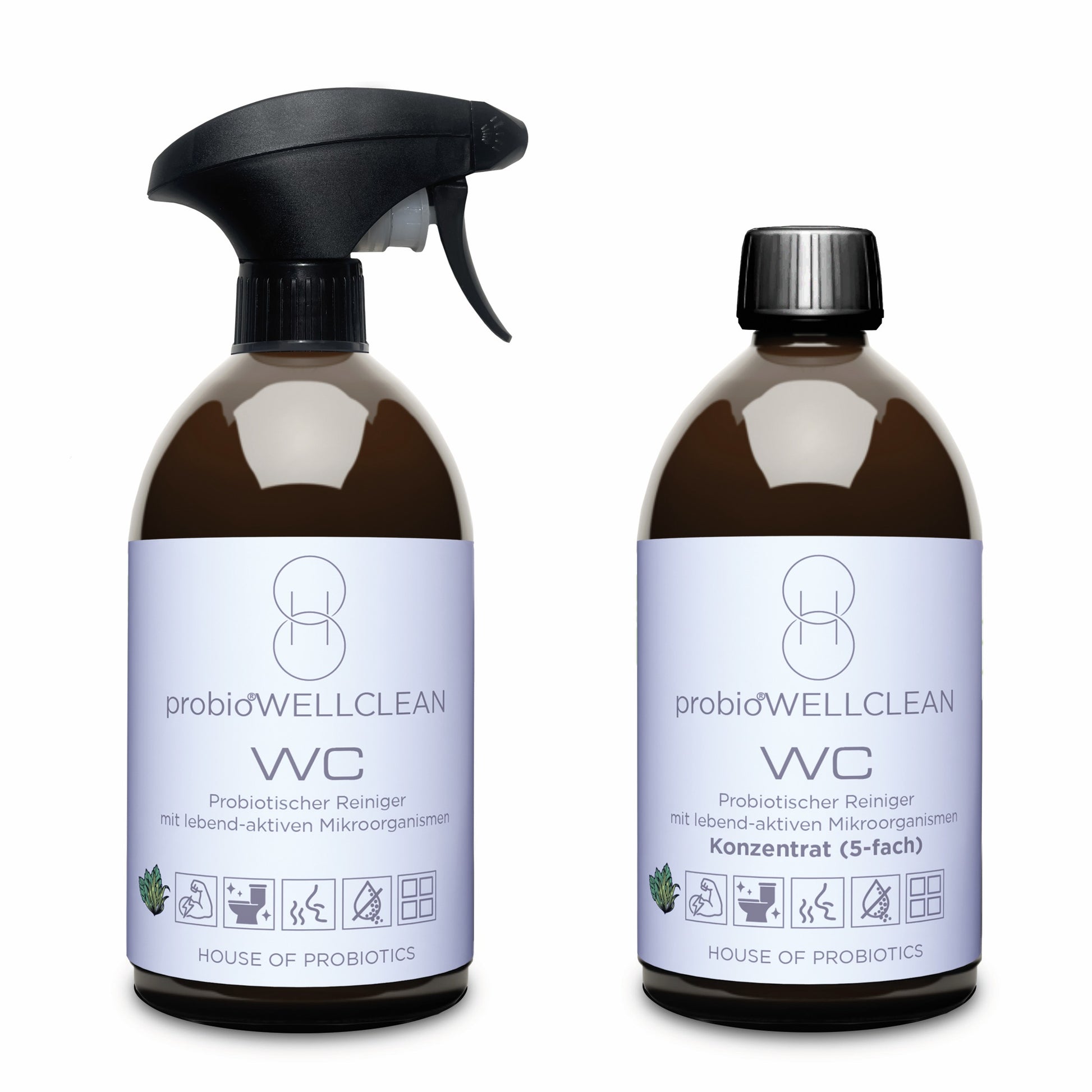 Das 2er Set probioWELLCLEAN WC Reiniger von HOUSE OF PROBIOTICS besteht aus einer Flasche (500ml) sofort anwendbarem „Ready for Use“-Reiniger und einer Flasche (500ml) 5-fach-Konzentrat. Dieses Konzentrat ergibt 5 weitere Flaschen probioWELLCLEAN WC Reiniger (jeweils 100ml Konzentrat aufgefüllt mit 400ml kaltem Leitungswasser). Somit ergibt dieses 2er Set insgesamt 6 Flaschen probioWELLCLEAN WC Reiniger.